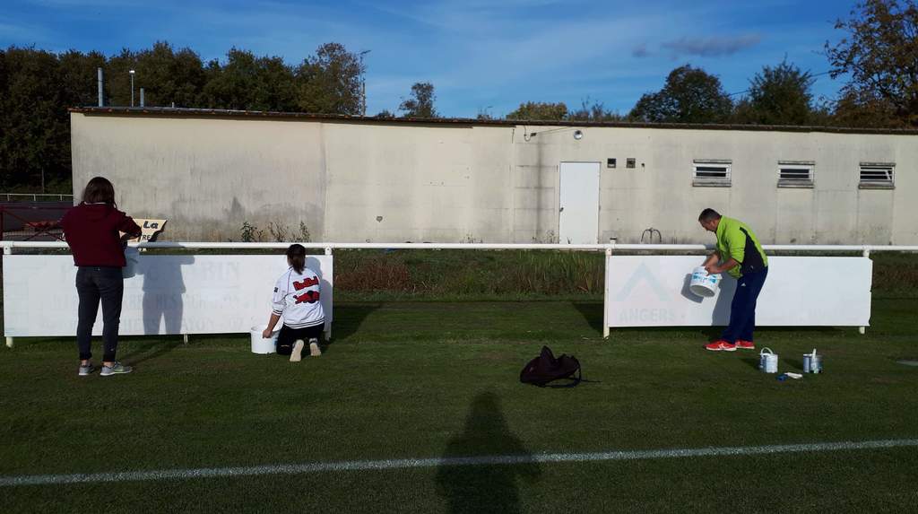 Blanchiment des anciens panneaux publicitaires du terrain d'honneur.