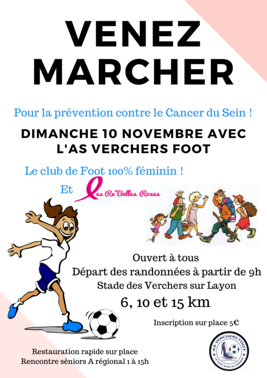 Cela va maintenant devenir un rendez-vous à ne pas louper... L'AS Verchers et Les Re-belles se retrouvent cette année encore à l'occasion de la Marche Rose. Celle-ci se tiendra le dimanche 10 novembre au stade des Verchers comme se fût le cas les années précédentes. Trois parcours de seront proposés pour plaire à tout le monde avec des distances de 6, 10 et 15 km.